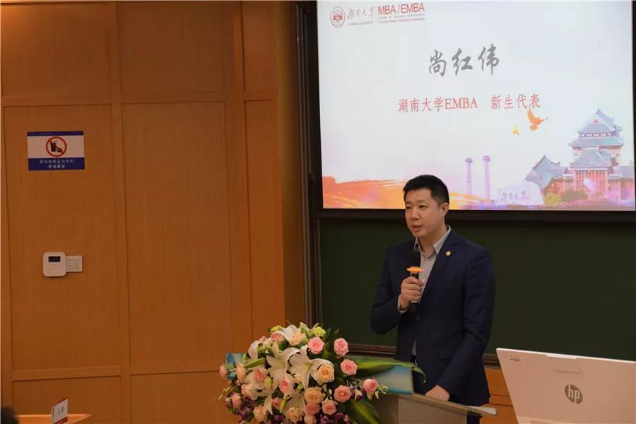 39班新生代表尚红伟发言说,为什么选择湖南大学?是因为湖南大学将敢于创新、锐意进取的湖湘精英聚集在了一起。今日梦圆,回想起曾经的努力和苦读都是值得的。“人因梦想而伟大,因学习而改变。希望未来我们能通过学习开拓视野,从战略高度审时度势,践行工商管理学院知行合一、正道致远的精神,让人生更有意义。”