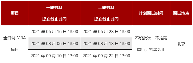 2022年全日制MBA项目的一轮材料提交最终截止时间为2021年09月10日13:00,二轮材料提交最终截止时间为2021年09月22日13:00,申请人必须在此之前在线填写材料,检查无误后直接在线提交。