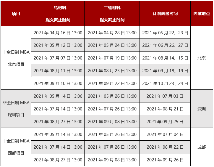 2022年非全日制MBA北京项目的一轮材料提交最终截止时间为2021年09月10日13:00,二轮材料提交最终截止时间为2021年09月22日13:00;2022年非全日制MBA深圳、西部项目的一轮材料提交最终截止时间为2021年08月27日13:00,二轮材料提交最终截止时间为2021年09月08日13:00。申请人必须在此之前在线填写材料,检查无误后直接在线提交。