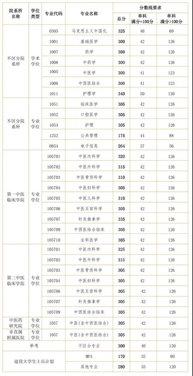 1.我校临床各专业专业学位(专业代码:1051、1052、1054、1057)的校内基础分数线:总分不低于 305分,英语不低于 42分;