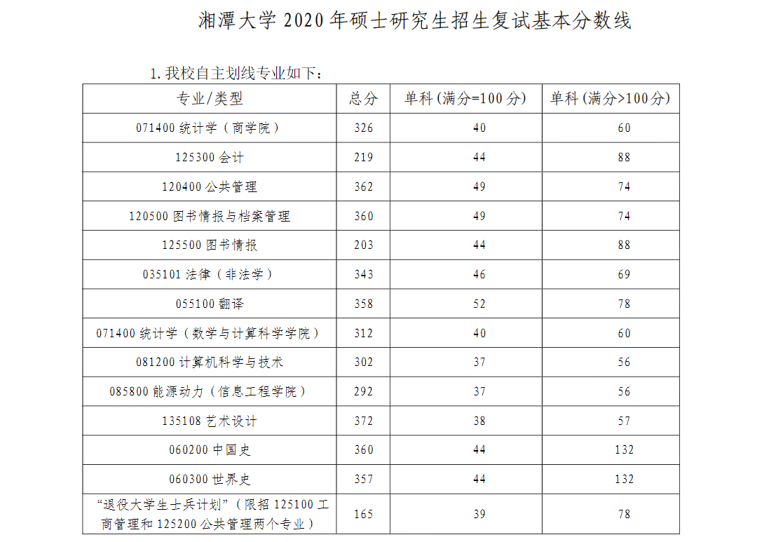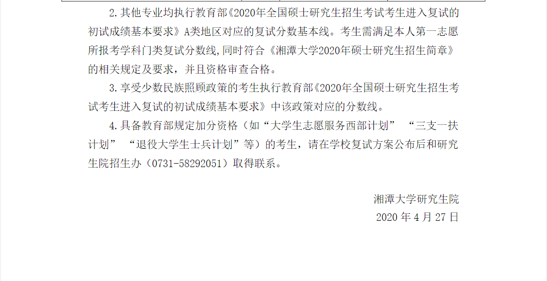 湘潭大学 2020 年硕士研究生招生复试基本分数线