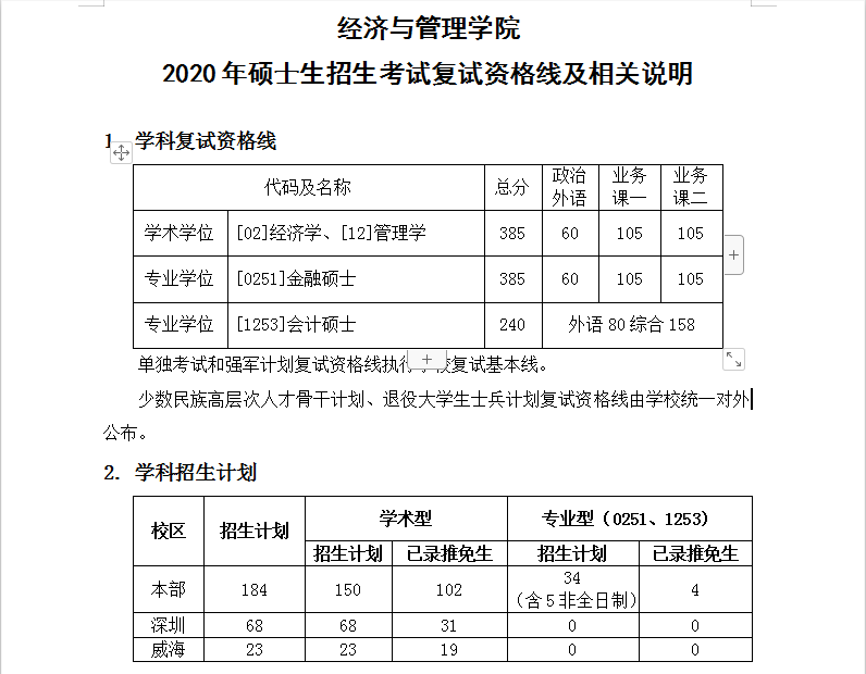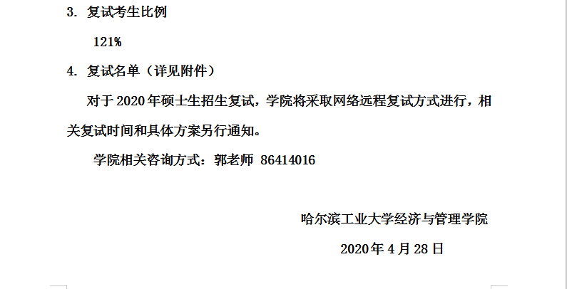 哈尔滨工业大学经济与管理学院 2020年硕士生招生考试复试资格线及相关说明