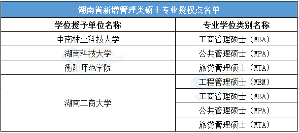 如今,经过3个多月的公示后,这些硕士授权点院校已经正式获批!其中,湖南省有4所院校新增了7个管理类硕士专业授权点:
